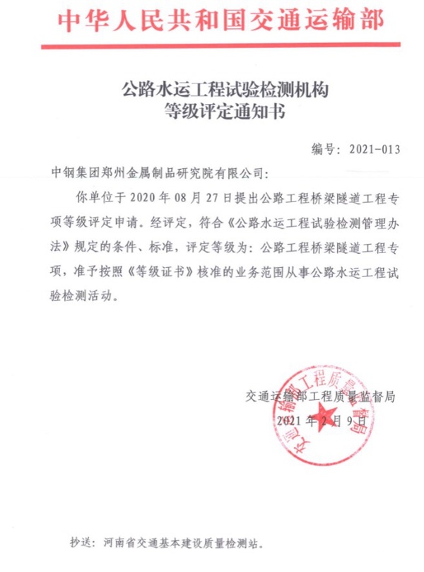 2月8日,隨著評(píng)定結(jié)果公示期結(jié)束,中鋼集團(tuán)鄭州金屬制品研究院順利通過(guò)交通運(yùn)輸部橋隧專項(xiàng)等級(jí)評(píng)定,正式成為橋梁隧道工程專項(xiàng)試驗(yàn)檢測(cè)機(jī)構(gòu)。